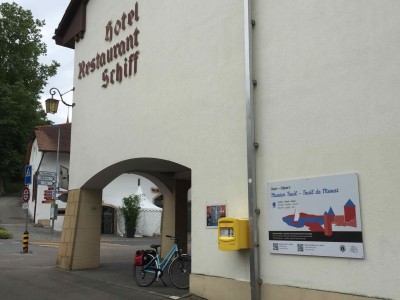Steh auf der östlichen Seite des Hotels Schiff beim Hafen in Murten und fotografiere mit Deinem Smartphone den QR-Tag auf dem Plakat des Murten Trail.