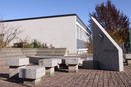 Zwischen dem alten Primarschulhaus und dem Neubau aus den frühen 70er-Jahren gestaltete der Murtner Steinbildhauer Daniel Burla eine skulpturale Anlage. In einer langen, flach gelegten Platte wurde ein ovales Brunnenbecken ausgemeisselt. Die Form des Brunnenbeckens – ist es ein Oval oder eine Acht, eine Endlosschleife? - scheint nicht zufällig gewählt worden zu sein. Seitlich am grossen Zeigerstein kann der Betrachter die Uhrzeit ablesen, auf der östlichen Seite die Vormittagsstunden, auf der westlichen Seite die Nachmittagsstunden.